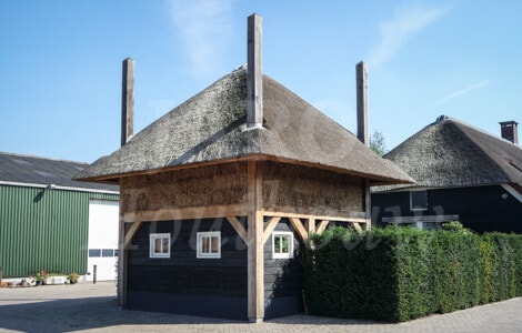Op deze pagina ziet u enkele foto’s van een gerealiseerde houten hooimijt in Zeeland. De complete constructie van de hooimijt is vervaardigd uit duurzaam eikenhout. Deze prachtige houtsoort verzorgt een natuurlijke en landelijke uitstraling. De authentieke hooimijt is uitgevoerd met riet als dakbedekking. De rietgedekte hooimijt past perfect bij de uitstraling van het erf. Onderstaand ziet u enkele foto’s en kunt u ook zien dat de houten hooimijt in Zeeland is uitgevoerd met glazen deuren aan de voorzijde en binnen is ingericht middels een sfeervolle bar.